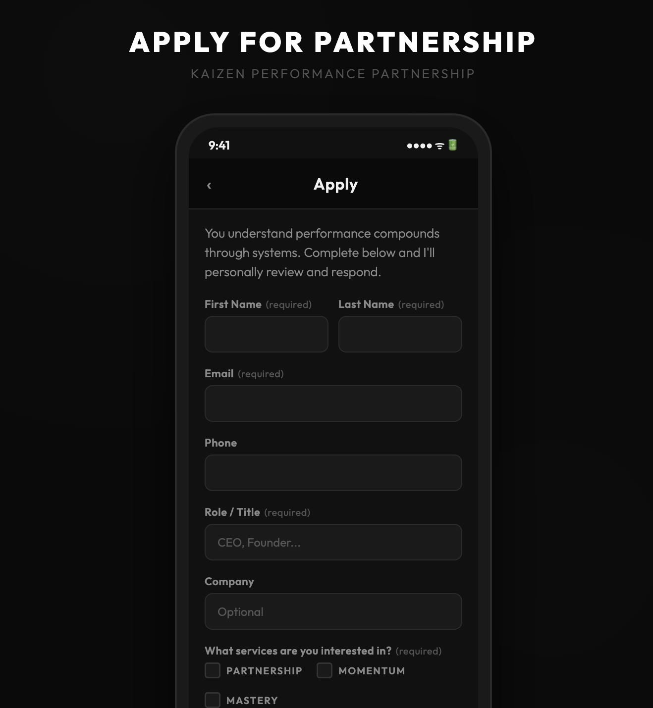 You understand performance compounds through systems. Let's confirm Kaizen fits your edge. Complete below and I'll personally review and respond